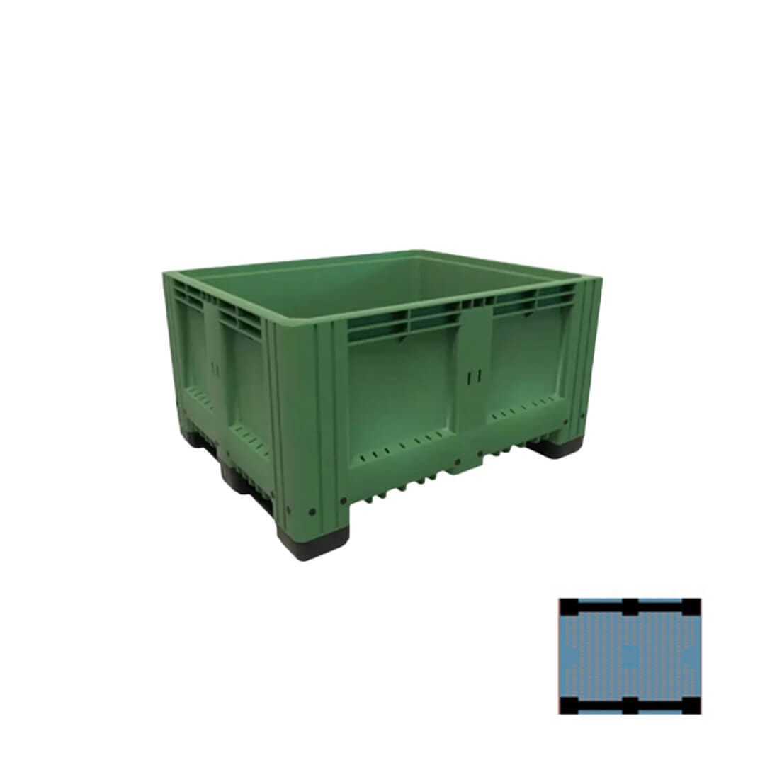 Descripción: Polietileno de alta densidad, resistencia máxima ante agentes acidos, basicos y alcalinos. U.V. estabilizado, 100% reciclable. Sin superficies cortantes, seguros al apilarse. Grado alimenticio aprobado por la FDA, el BIN cerrado. Dimensiones: Largo: 120 cm Ancho: 100 cm Alto: 58 cm 2 Traversas. Color: Verde.