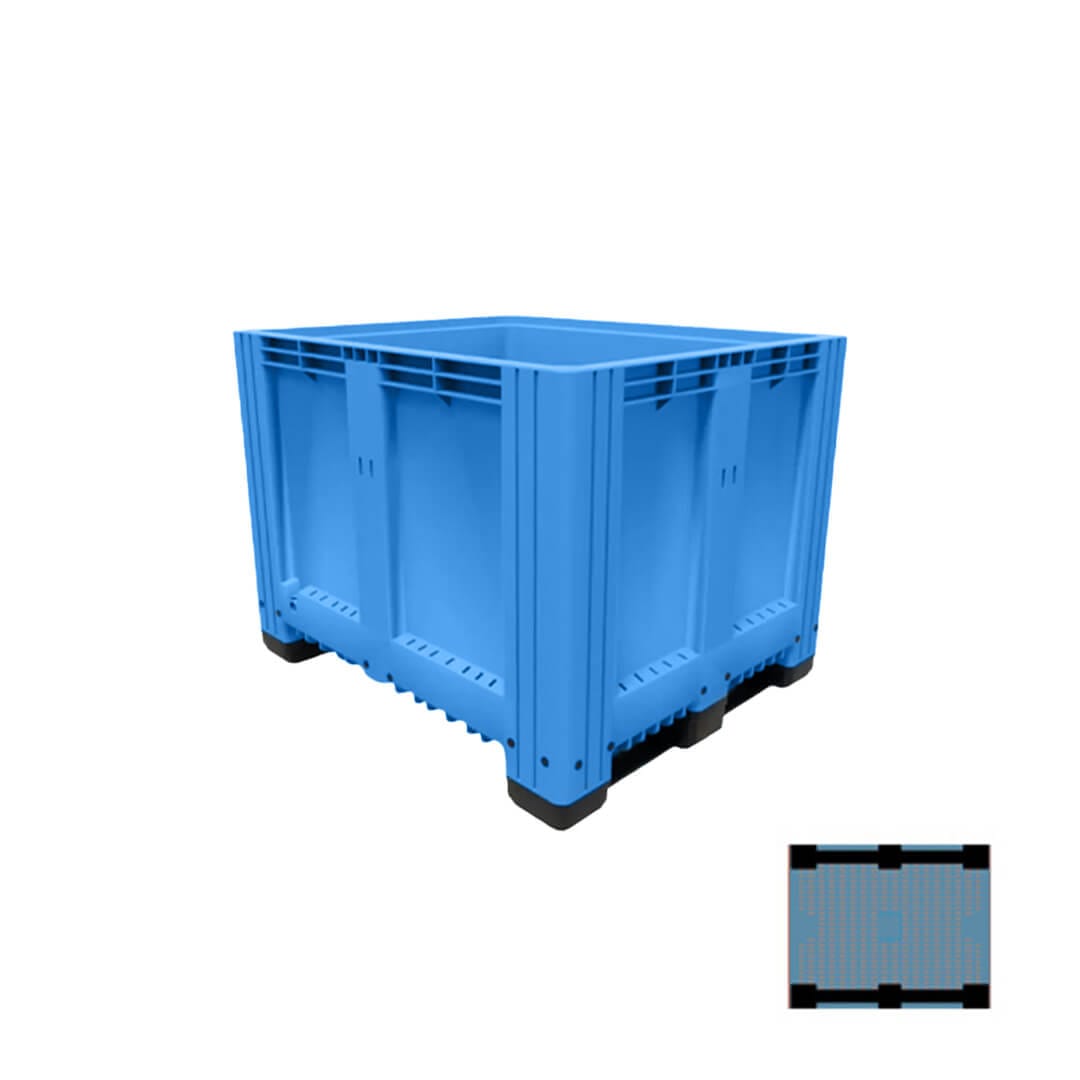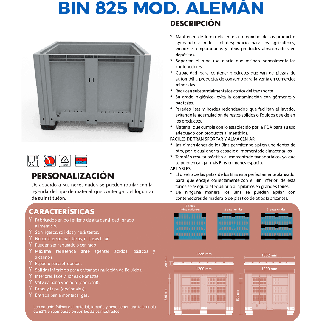 Descripción: Polietileno de alta densidad, resistencia máxima ante agentes acidos, basicos y alcalinos. U.V. estabilizado, 100% reciclable. Sin superficies cortantes, seguros al apilarse. Grado alimenticio aprobado por la FDA, el BIN cerrado. Dimensiones: Largo: 120 cm Ancho: 100 cm Alto: 82.5 cm 2 Traversas.Color: Azul.