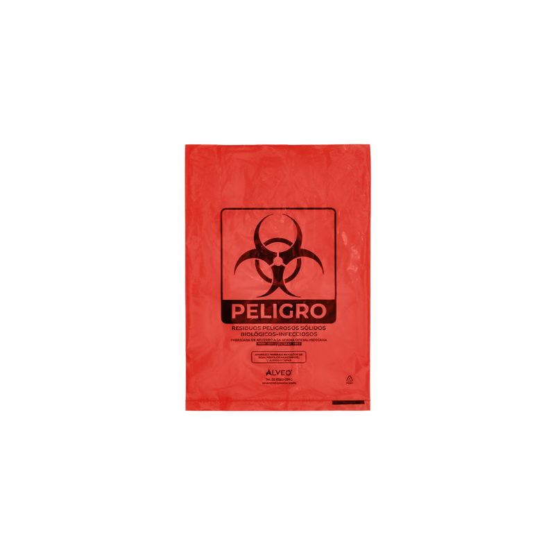 Descripción: Bolsa de polietileno de baja densidad, libre de metales pesados para la recolección de residuos biológico infecciosos. Carga Máxima: 1 kg. Impresa a una tinta con logotipo de biológico infeccioso. Sin Fuelles. Calibre 300. Medidas: Ancho: 20.0 cm. Alto: 30.0 cm. Color: Rojo.