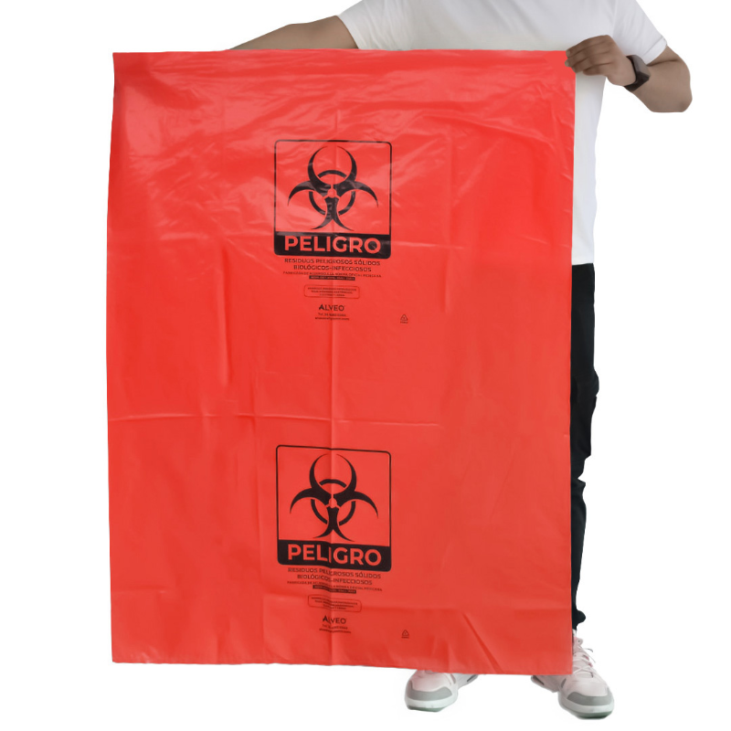 Bolsa de polietileno de baja densidad, libre de metales pesados para la recolección de residuos biológico infecciosos. Carga Máxima: 30 kg. Impresa a una tinta con logotipo de biológico infeccioso. Con fuelles. Calibre 300. Medidas: Ancho: 90.0 cm. Alto: 120.0 cm. Color: Rojo.