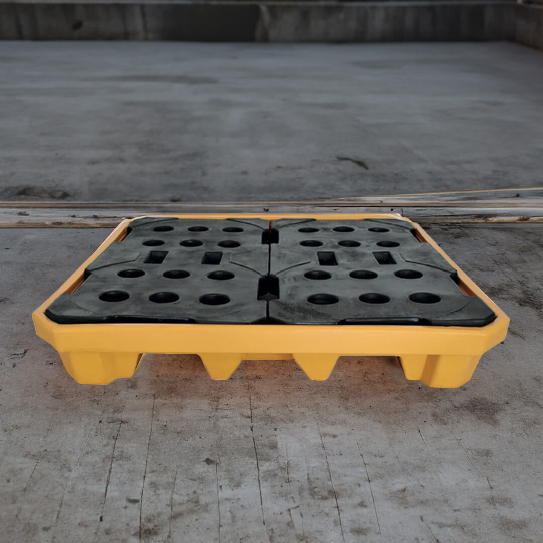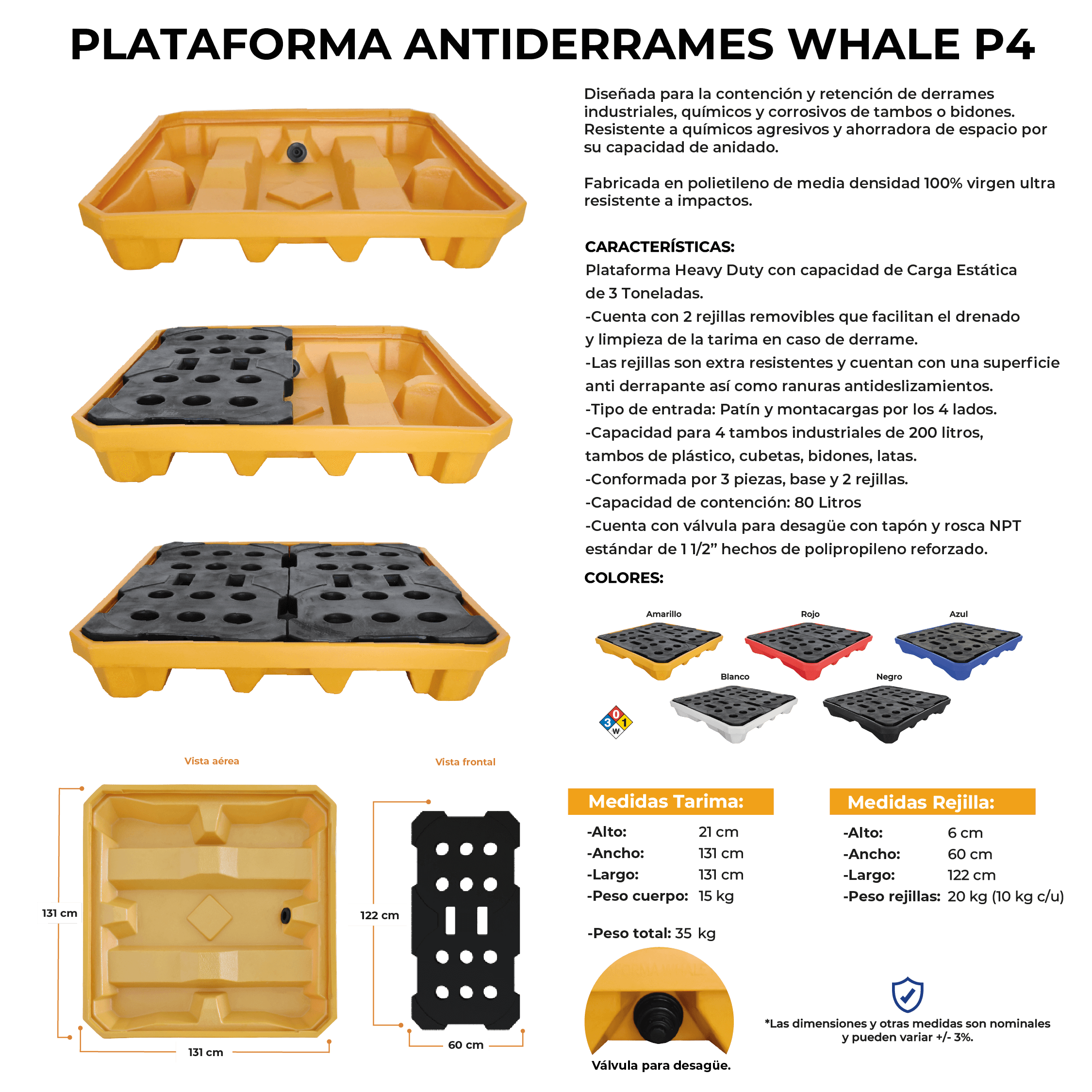 Descripción: La plataforma antiderrames Whale P4 está diseñada para la contención de derrames industriales, químicos y corrosivos de tambos o bidones. Fabricada en polietileno de media densidad 100% virgen. Habilitada para patín y montacargas por los 4 lados. Las rejillas cuentan con ranuras antideslizamientos.