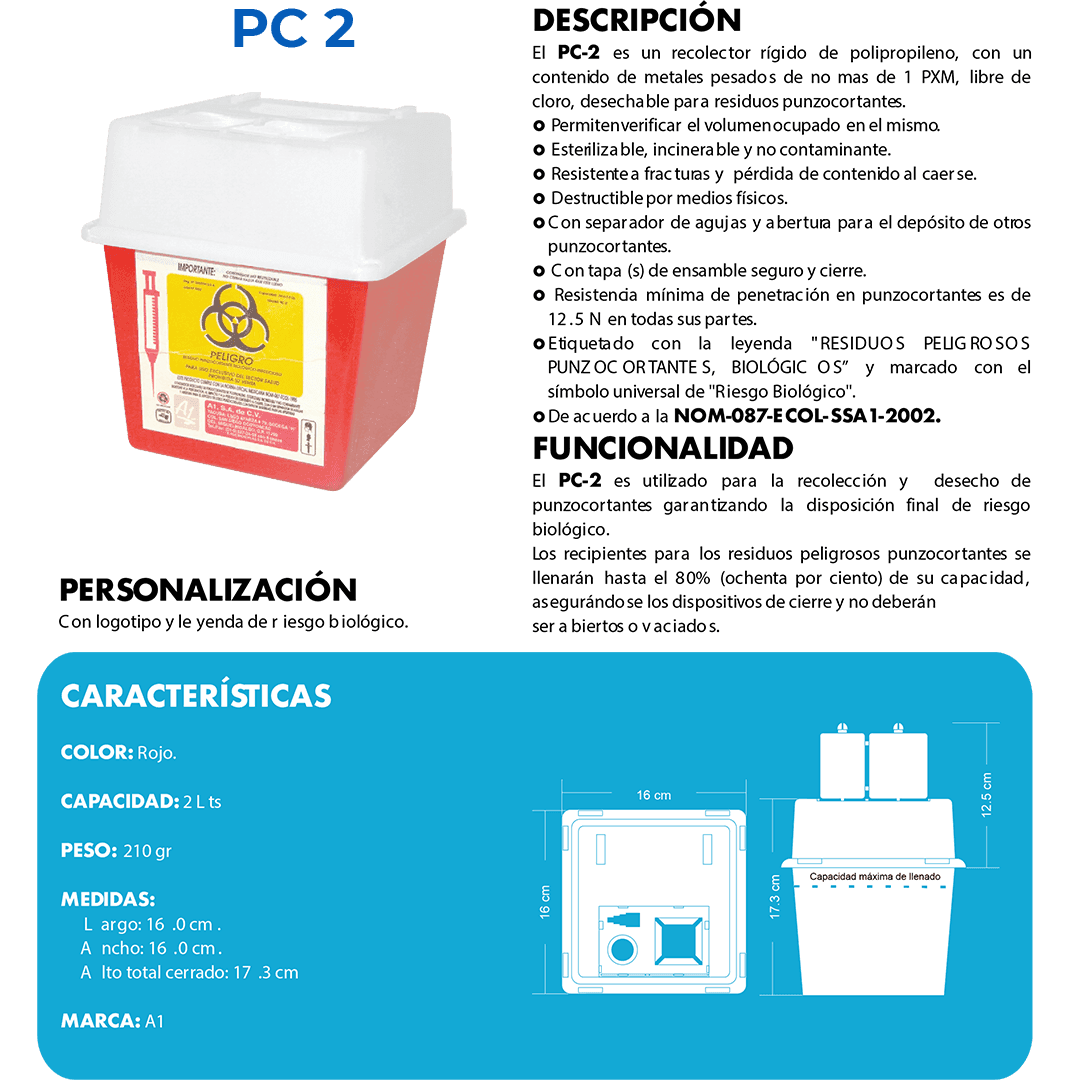 Descripción: Recolector de polipropileno para punzocortantes. Capacidad Volumen: 0.94 a 2.8 Litros. Medidas: Largo: 16.0 cm. Ancho: 16.0 cm. Alto: 24.4 cm.