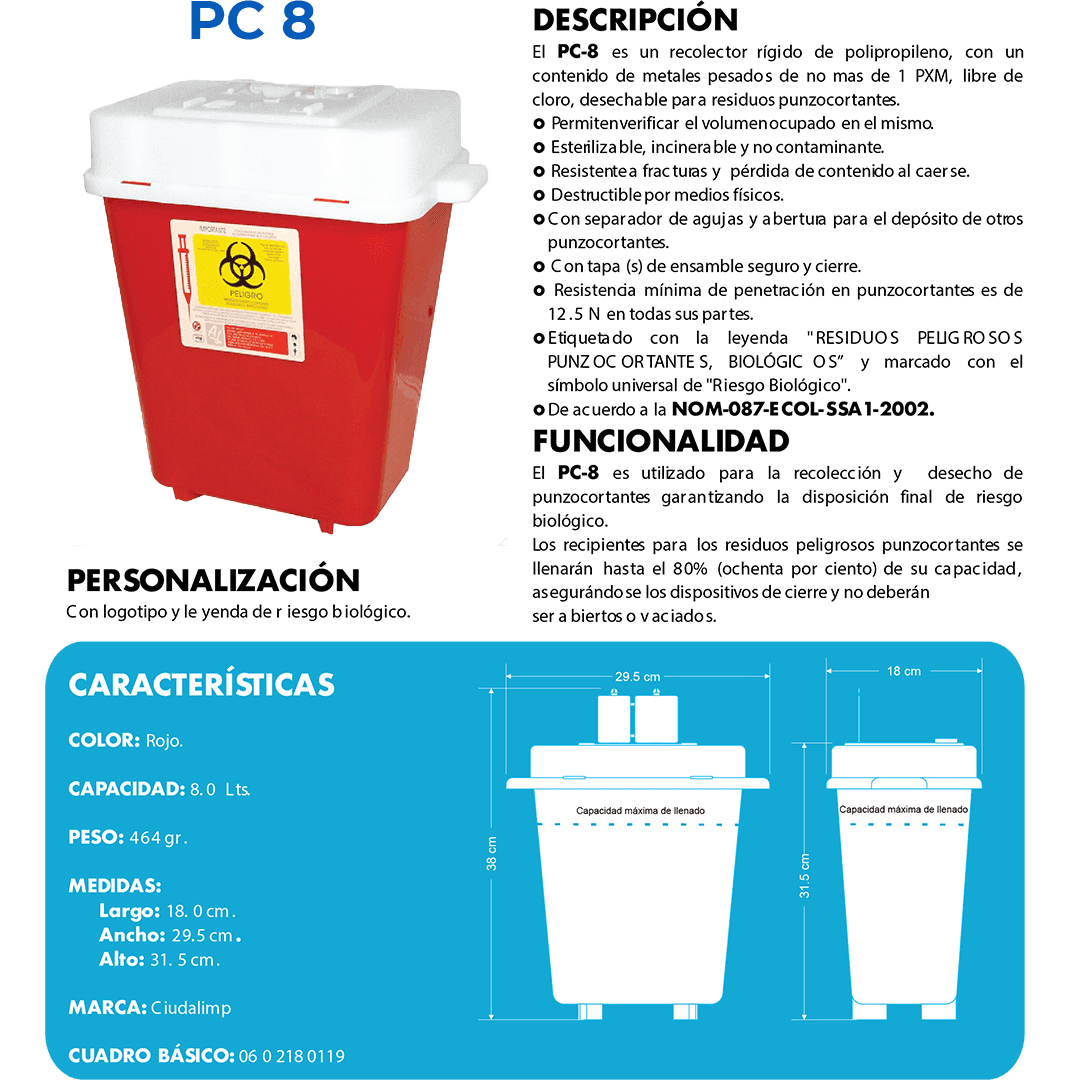 Descripción: Recolector de polipropileno para punzocortantes. Capacidad: 7.50 a 9.40 Litros. Medidas: Largo: 30.5 cm. Ancho: 18.0 cm. Alto: 38.7 cm.