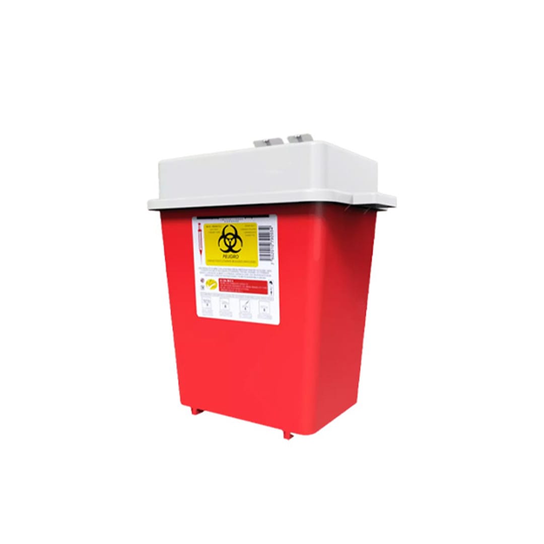 Recolector de polipropileno para punzocortantes. Capacidad: 7.50 a 9.40 Litros. Medidas: Largo: 30.5 cm. Ancho: 18.0 cm. Alto: 38.7 cm.